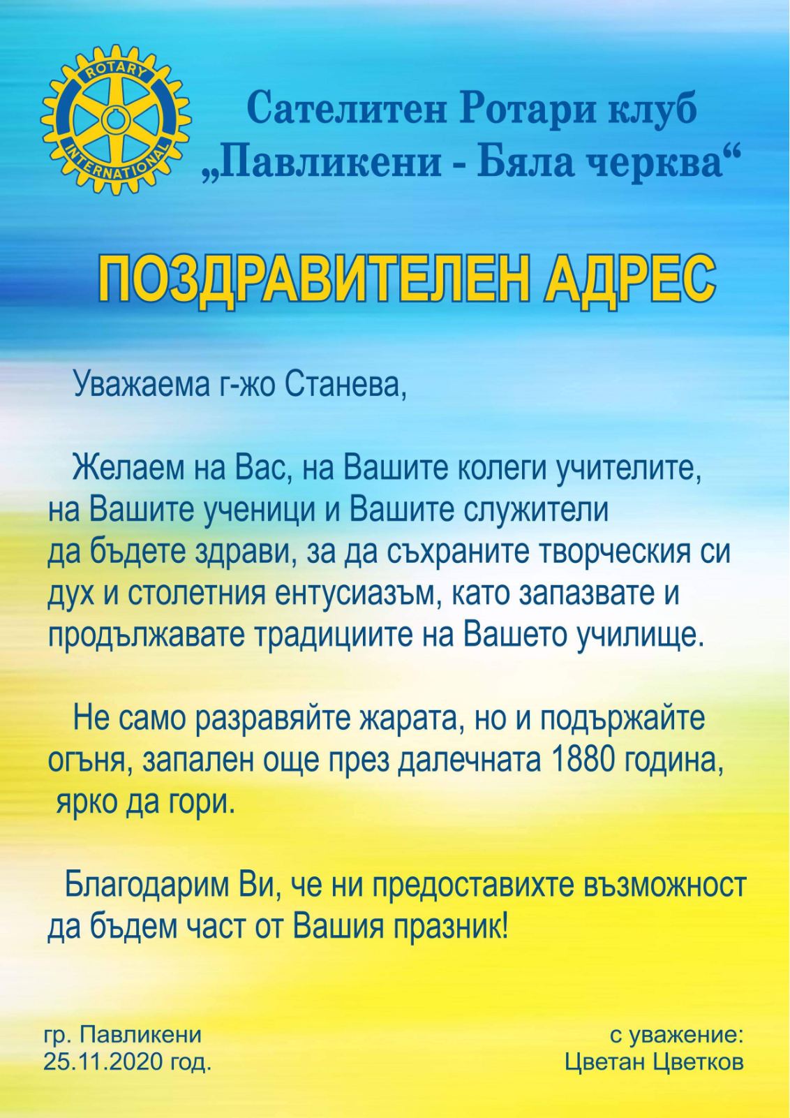 С радост и гордост членовете на Сателитен Ротари клуб Павликени/Бяла черква се отзовахме на поканата на директорката на ОУ „Св. Климент Охридски“ Павликени. г-жа Радка Станева, да вземем участие в честванията по повод на 140 годишнината на училището.